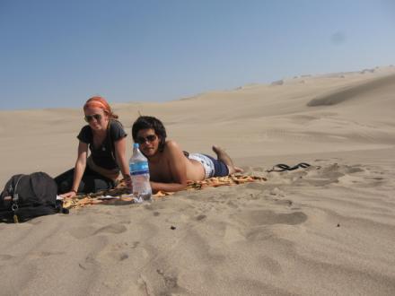 La fotito es de ayer… nos fuimos caminando hasta adentrarnos en el desierto y no ver mas gente… llevamos para hacer sanguchitos… (nos olvidamos la jamonada, así que comí con tomate, sí, como escucharon… mami comí tomate… Johi Lu, comí tomate… jajaj) y bueno después pachorreamos todo el día bajo el sol del desierto. Nos dormimos un rato, escribimos otro rato, y Pablis me leyó unos cuentos de un escritor mexicano muuuy buenos…