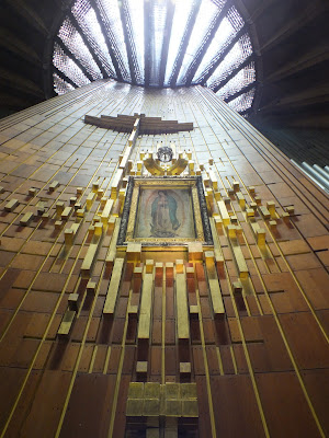 La historia es muy linda. La resumo. Es una virgen con rasgos mestizos, es morenita. Y lo que uno vé allí, es una tela (un ayampe) con la imagen de la Virgen, que un campesino usó para cargar flores, en un lugar donde no crecían esas flores, para demostrar que debían construirle una Iglesia para la Guadalupe. Algo así. La cuestión es que me cae re bien!