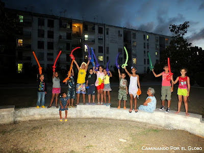 En otro lugar donde globologiamos, fue en El Parque Céspedes en Santiago de Cuba. Luego de un día cansador de recorrida por la ciudad, fuimos a «hacer plaza». Y había un nene al lado nuestro con unas señoras muy simpáticas. Y dije: vamos a hacerle un globito. Bueno, le hicimos un tigre y el nene estaba re contento jugando como si fuese un juguete de verdad. Eso me encantó. Después se acercaron tres hermanitos que también les hicimos globos. En seguida los colores de los globos Qualatex empezaron a brillar en la noche, y se empezaron a acercar cada vez más chicos (y adultos pesados también!). En un momento se juntaron unos 6 chicos grandecitos, que les enseñé a hacer la espada y el perrito. Aprendieron super bien. Pero después eran tantos los nenes, que tuvimos que hacérselos nosotros. Tuvimos que organizar una fila porque era un desorden. Todos querían su globito.