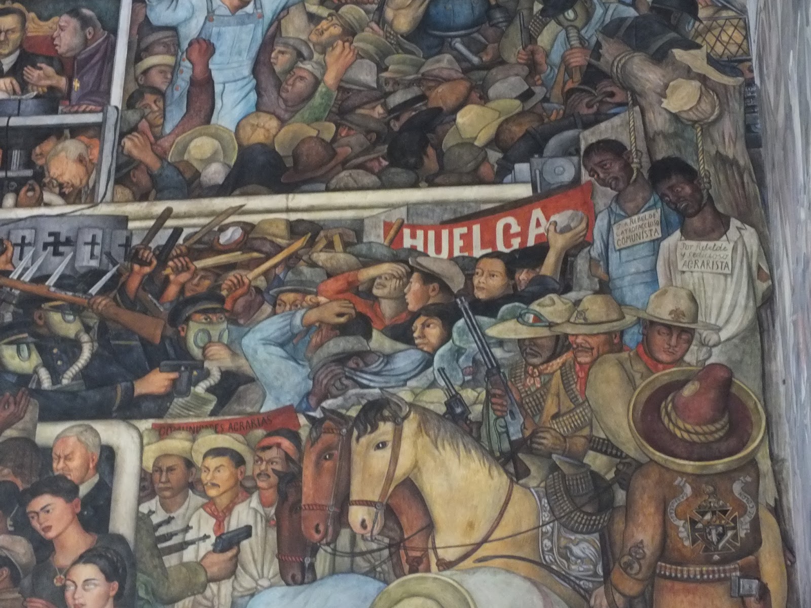 y los murales de Diego Rivera, que no entiendo cómo hizo para plasmar toda la historia y forma de vida de la población de México en distintas épocas. Mi mamita aceptó que un señor de allí nos explicara los murales. Ay, no saben lo que era éste señor. Entendimos la mitad de las cosas, porque tenía como unos dientes postizos que hacían que se le escape el aire y solo se entendía shasheshishoshu, lo cual nos puso un poquito nerviosas, y a la vez nos causaba gracia.