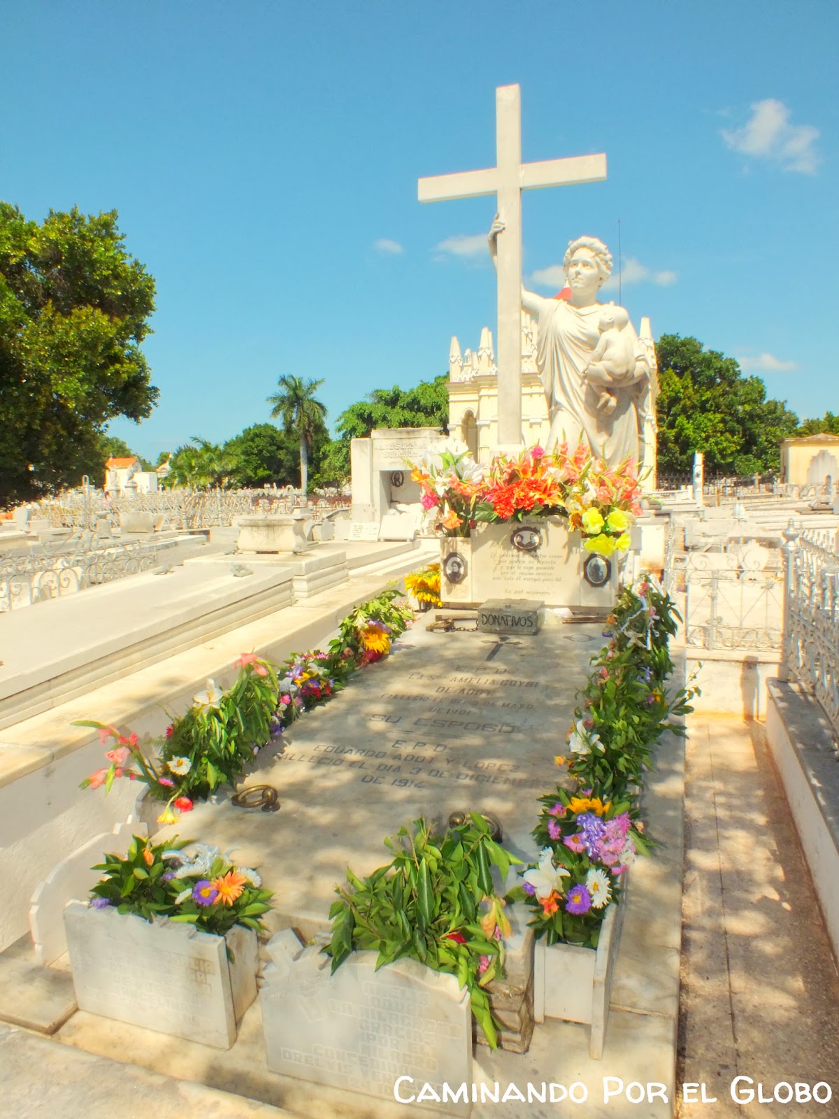 Cuando volvimos a Cuba, el día de la llegada nos fuimos al Nuevo Vedado a almorzar a la casa de una señora que yo le llevé unos medicamentos para la diabetes, y en agradecimiento nos invitó a la casa. Pasamos un rato muy lindo con la familia además de comer muy muy rico. Luego fuimos a pasear al cementerio que es muy lindo e interesante. La foto es de la tumba de la Milagrosa Amelia. Es una joven que murió al dar a luz y fue enterrada con su bebe. Su esposo iba a verla todos los días y le llenaba la tumba de flores frescas. Pronto se corrieron rumores y se formó una leyenda en torno a Amelia. La gente le pide milagros y que cuide a sus hijos. Le dejan muchas placas en agradecimiento, con casitas en miniatura. Es impresionante la cantidad y los lindos mensajes.