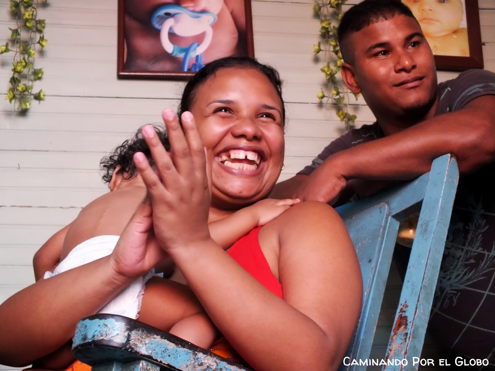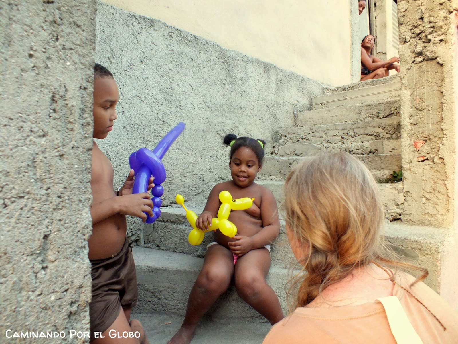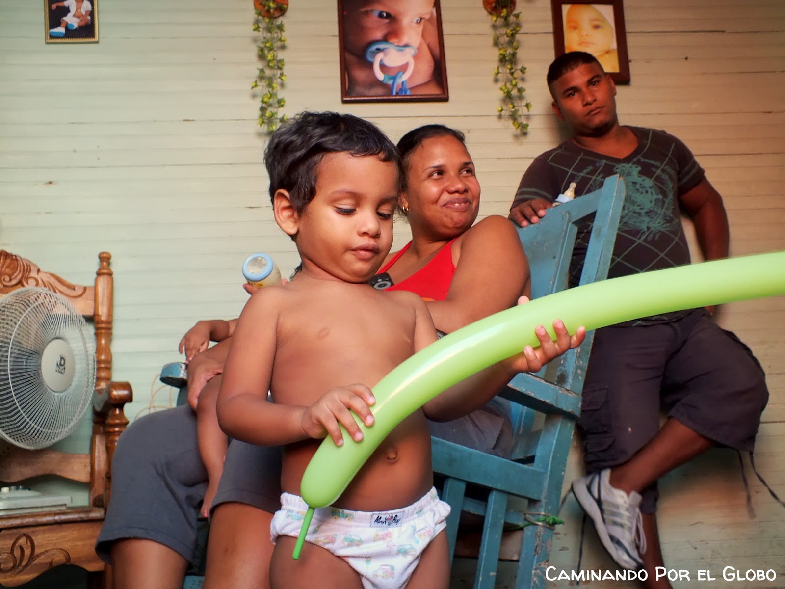 En la misma ciudad los globos nos regalaron a nosotros un rato muy lindo en la casa de una familia. Íbamos caminando y vimos la puerta de una casa abierta y adentro una señora sentada en una mesedora con sus dos hijos en los brazos viendo la tele. Jaimis le pidió permiso para sacarle una foto, y la señora muy simpática accedió. Charlando le preguntamos si le podíamos regalar unos globos a sus hijos. Así que nos hizo entrar a su casa y pasamos un momento hermoso.