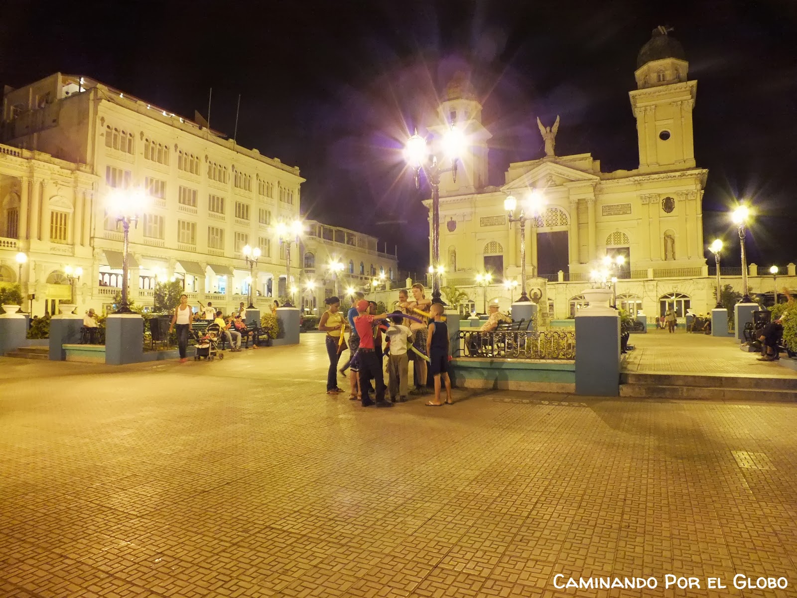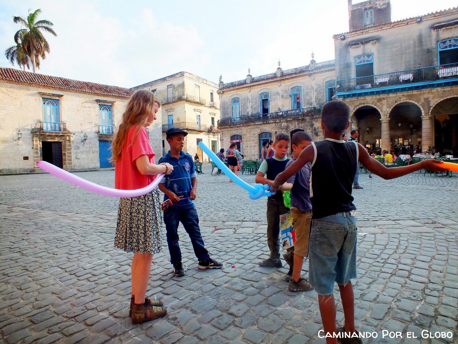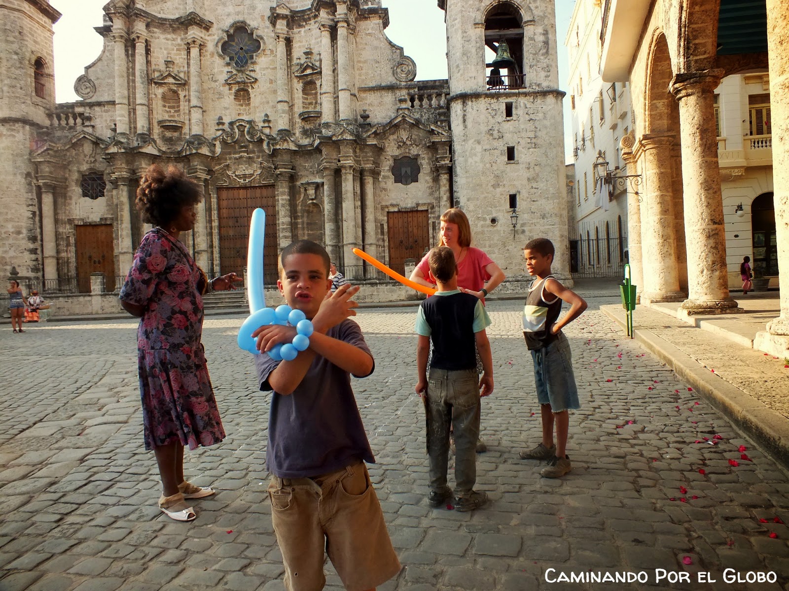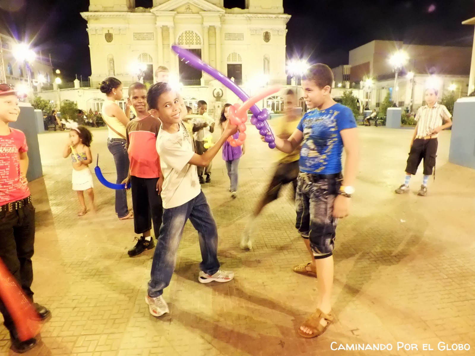 En otro lugar donde globologiamos, fue en El Parque Céspedes en Santiago de Cuba. Luego de un día cansador de recorrida por la ciudad, fuimos a «hacer plaza». Y había un nene al lado nuestro con unas señoras muy simpáticas. Y dije: vamos a hacerle un globito. Bueno, le hicimos un tigre y el nene estaba re contento jugando como si fuese un juguete de verdad. Eso me encantó. Después se acercaron tres hermanitos que también les hicimos globos. En seguida los colores de los globos Qualatex empezaron a brillar en la noche, y se empezaron a acercar cada vez más chicos (y adultos pesados también!). En un momento se juntaron unos 6 chicos grandecitos, que les enseñé a hacer la espada y el perrito. Aprendieron super bien. Pero después eran tantos los nenes, que tuvimos que hacérselos nosotros. Tuvimos que organizar una fila porque era un desorden. Todos querían su globito.