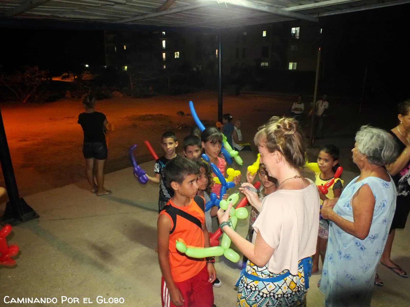 Por último mi mayor satisfacción fue en Guardalavaca. Allí es una de las playas turísticas de Cuba donde hay hoteles 5 estrellas al lado del mar. Pero atrás, están los edificios de la gente que vive allí y trabaja en esos hoteles. Ahí nos hospedamos nosotros y cuando le contamos a la señora lo que hacíamos, aviso a los nenes del edificio para hacer un taller en el parque. Aunque muchos su fueron por las vacaciones, se iban sumando chicos y al final del taller eran como 20. Después de este taller me quedé con cosquillitas en la panza de felicidad. Salió todo demasiado bien. Primero hicimos todas las formitas de animales y los chicos se divertían mucho tratando de adivinar lo que eran. Después le repartimos un globo a cada uno. Todos tuvieron paciencia para esperar su turno. Y cuando todos tenían su globo aprendieron a hacer la espada. Hasta una nena de unos 5 o 6 años, con ayudita pudo hacer sus globos. Luego cambiamos de lugar, ya habían más nenes, y les volvimos a dar un globo a cada uno. Todos aprendieron a hacer el perrito muy bien, hasta los mas peques. Y por último hicieron una fila para que les dibuje ojitos, bigotes, nariz y boca a sus perros, y que les escriba su nombre. ¡Eso fue complicado, porque tienen nombres muy raros y yo parecía ignorante que no sabía como escribirlos! Todos los chicos se fueron contentísimos de ver lo que pudieron hacer ellos con sus manitos. Y yo me fui más feliz que ellos.