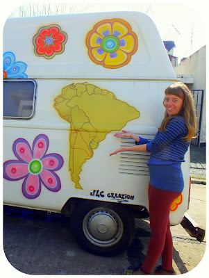 Con mi mejor amiga Lucía Racov, hicimos realidad nuestro sueño de ir a recorrer Latinoamérica. Lo hicimos en una kombi Volkswagen modelo 88 que era una ambulancia que estaba fuera de uso desde hacía 7 años. Para no tener problemas en la ruta, y como teníamos poca plata, decidimos tapar la pintura de ambulancia con aerosol. Y para eso le pedimos a un chico que hace grafittis en la calle, que nos pinte unas flores en la camioneta. (que no es la pintura que se ve en esta foto). Quitamos del interior los rieles de la ambulancia, armamos una madera que sería algunas veces cama, otras cocina y otras taller de artesanías. Colocamos unos armarios para poder guardar nuestras cosas, y casi sin haberla manejado antes, salimos a la ruta. Para poder realizar el viaje, ambas suspendimos nuestras carreras, Lu arquitectura y yo Ingeniería civil. Juntamos algo de plata antes de salir vendiendo tortas y portarretratos y llevamos materiales para hacer artesanías (que todavía no sabíamos hacer). Con el dinero que juntamos (masomenos 800 dolares) salimos de viaje.
